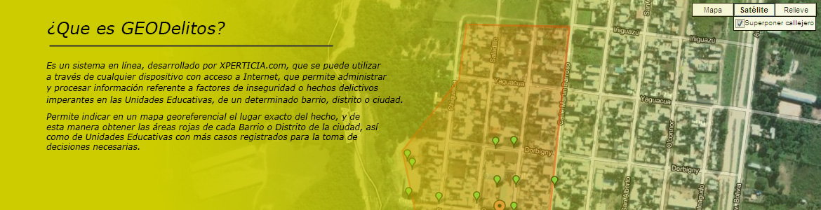 Espacio destinado a la presentación de un mapa georeferencial en el cual se podrá elegir un Distrito o Barrio, ver sus delimitaciones, todos los hechos registrados y las instituciones en cada uno de ellos.