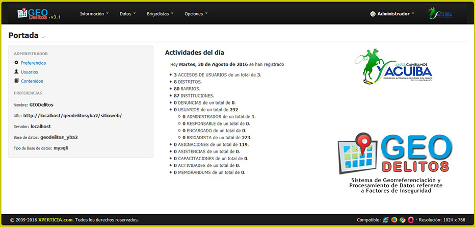 Es un sistema en línea, es decir, una aplicación que se puede utilizar a través de cualquier dispositivo con acceso a Internet, que permite administrar y procesar información referente a hechos delictivos o factores de inseguridad imperantes en un determinado Barrio, Distrito o Ciudad, con la denominación de DENUNCIAS. Además, permite registrar y administrar los diversos DISTRITOS y BARRIOS, existentes en el área de cobertura del sistema, con la posibilidad de indicar su centro y delimitaciones. De forma adicional, el sistema permite también registrar y administrar INSTITUCIONES o lugares de referencia para los diversos Barrios y Distritos del área urbana o rural. A partir de la carga de las Denuncias en el sistema, se puede obtener REPORTES estadísticos y gráficos en tiempo real. Esta versión de GEODelitos permite la administración de los SUPERVISORES y BRIGADISTAS, así como sus ASIGNACIONES, ASISTENCIAS, CAPACITACIONES, ACTIVIDADES y MEMORANDUMS.